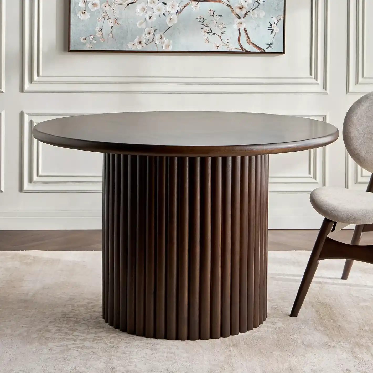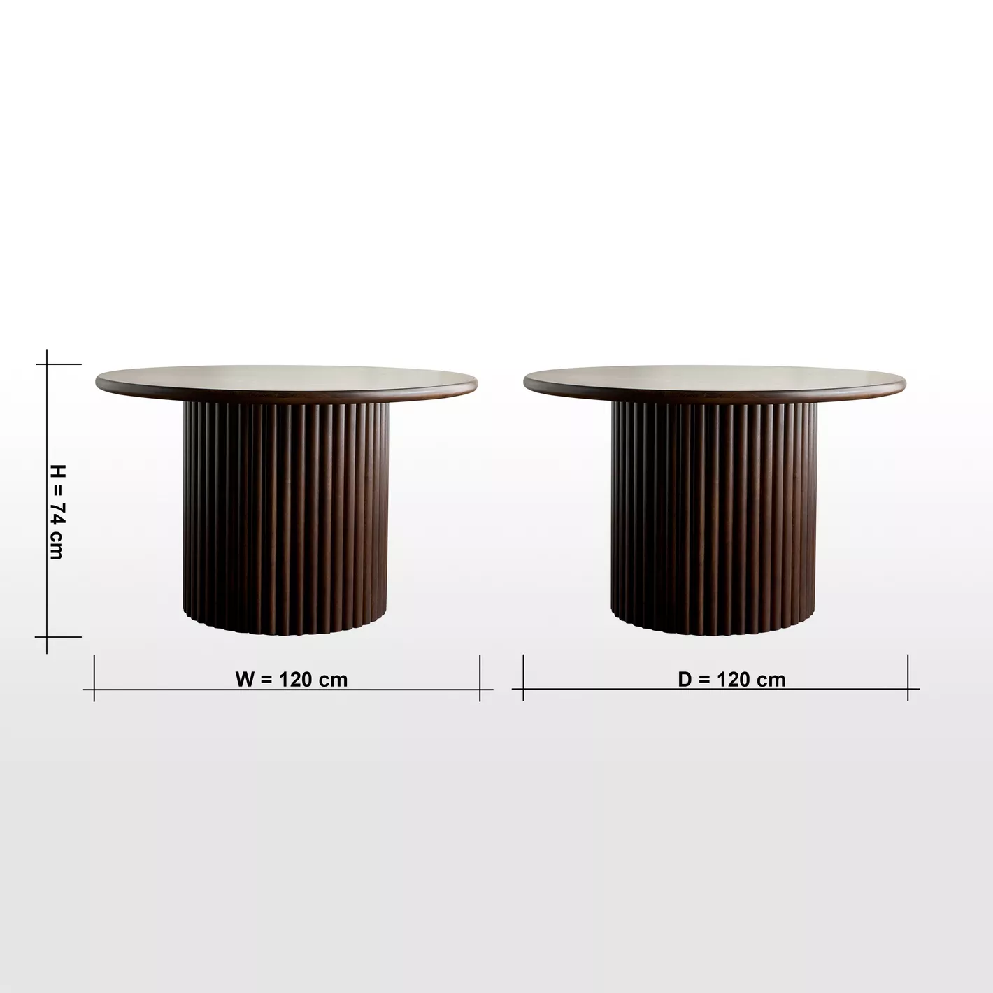 This four-seat table exudes sophisticated elegance with its rounded, dark-colored top, which adds a luxurious appeal. Its ribbed base ensures stability and charm. It is made of high-quality engineered wood, giving it exceptional durability. To maintain its beauty, it is recommended to clean it regularly to preserve its luster